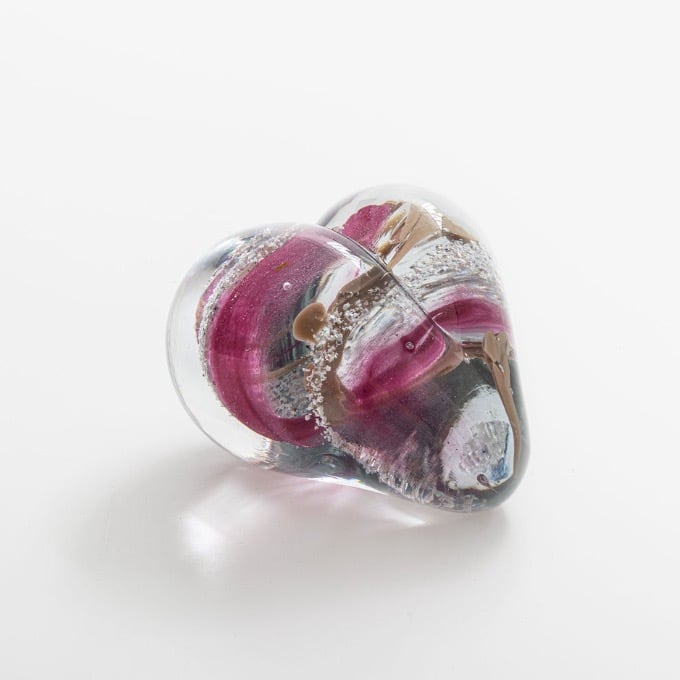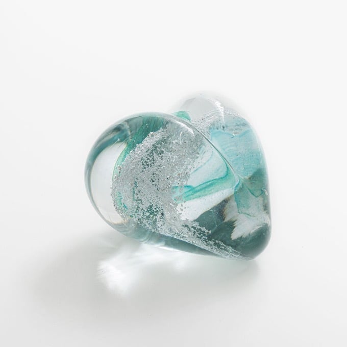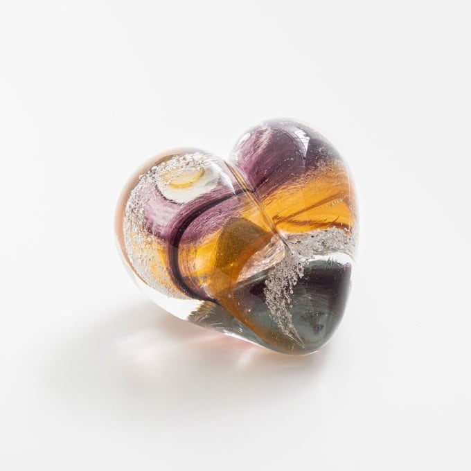 両手におさまるサイズのハート型のガラスアートです。気泡とカラーガラスが描く美しい曲線の中にランダムにご遺灰が封じ込められます。
