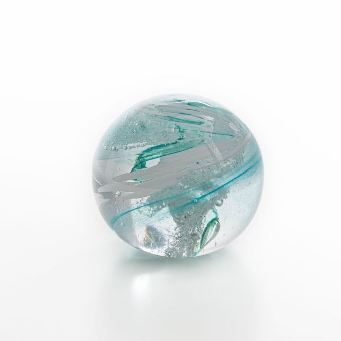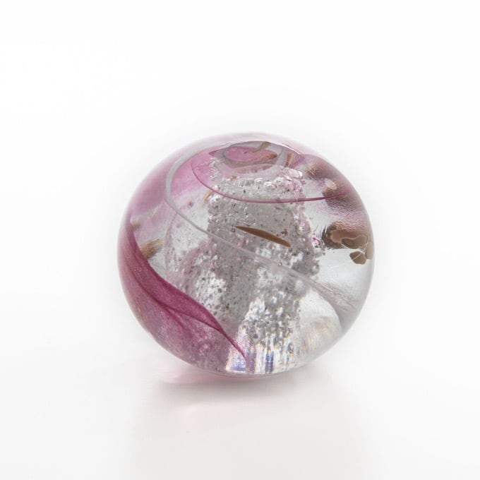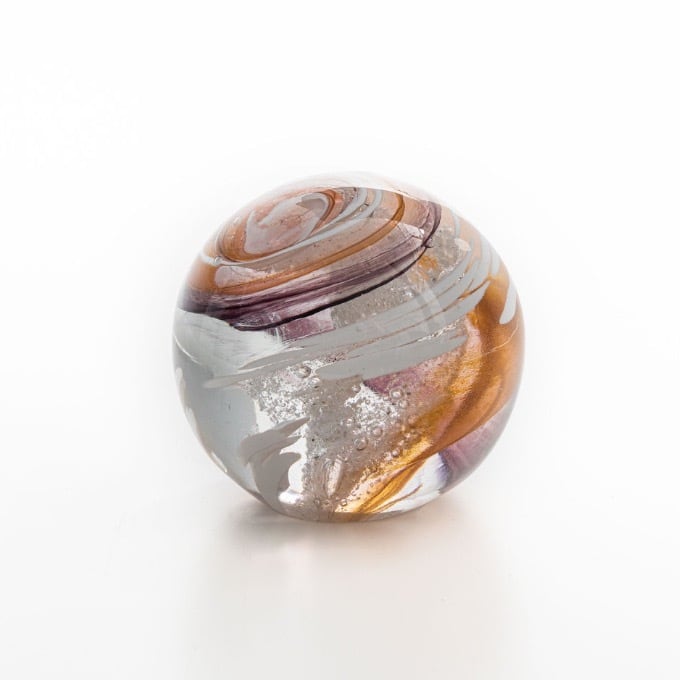 すっきりとした球体のガラスアートです。気泡とカラーガラスが描く美しい曲線の中にランダムにご遺灰が封じ込められます。